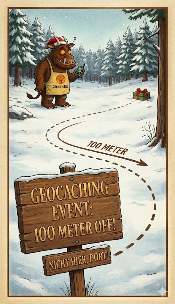 Wir wissen, was ihr denkt. Denn wir denken es auch. Ein Geocaching-Event am 31. Dezember bei (vermutlich) eisiger Kälte, an einem Ort, der bekannt dafür ist, nicht der Hit zu sein, und dann auch noch 100 Meter zum Loggen zu laufen? Wer ist so blöd?!