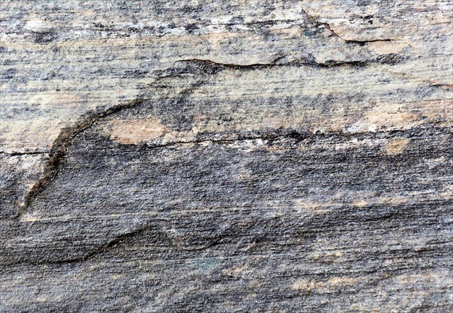 Les minéraux sont orientés parallèlement, ce qui donne au schiste son aspect feuilleté et brillant.