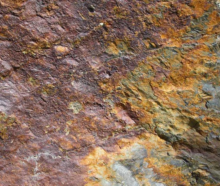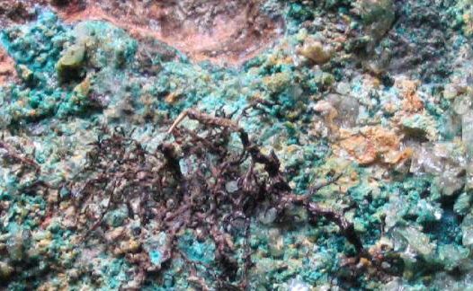 Cette oxydation forme des minéraux de cuivre secondaires qui donnent une teinte verte ou bleue à la roche.