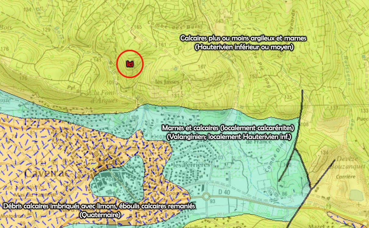 As can be seen on the geological map, the hill and the small cliffs that surround it are made up of Hauterivian limestone (-133 to -126 Ma) and Valanginian marl (-140 to -133 Ma), softer than the limestones on the flanks.