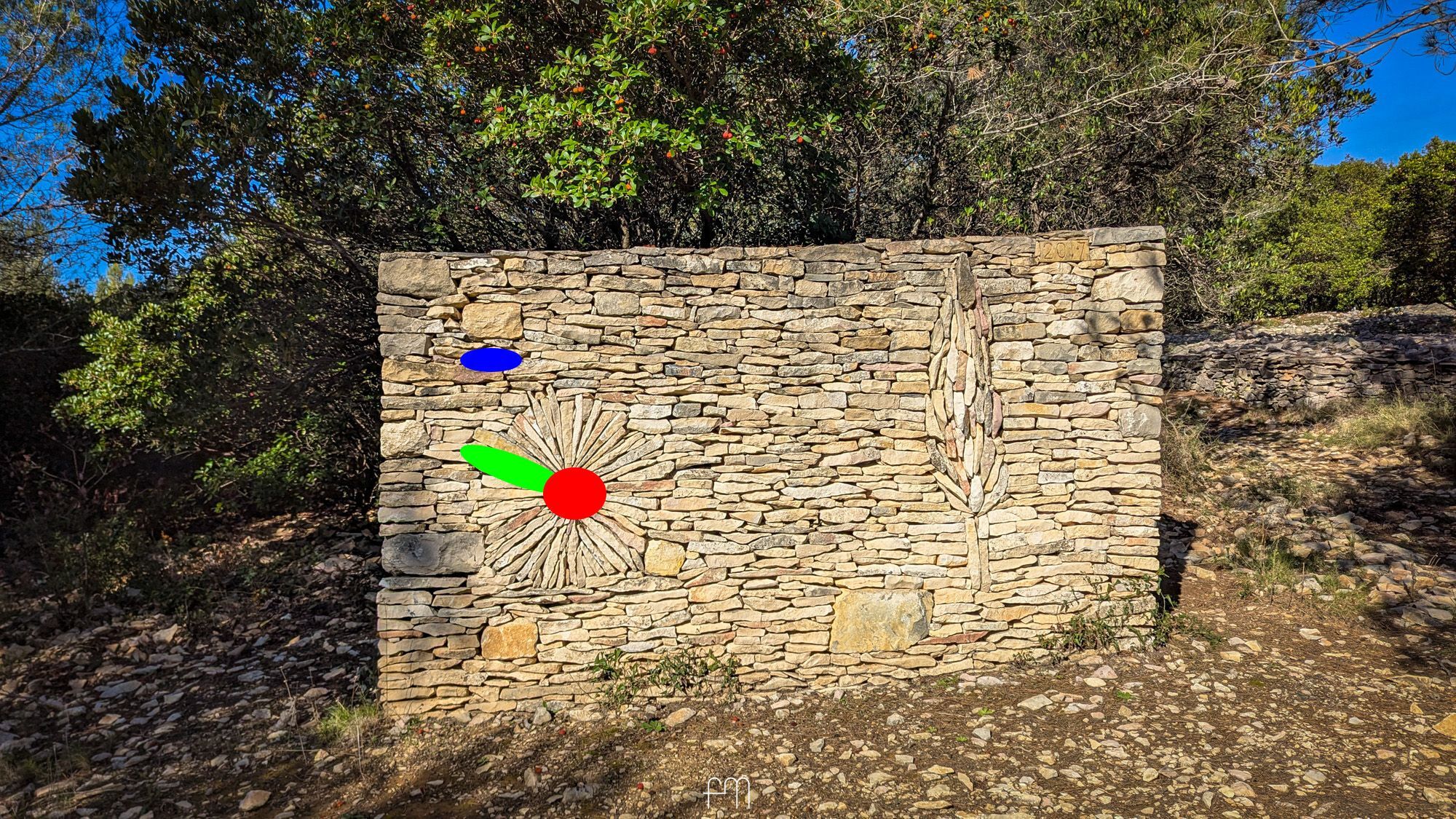 Le dernier ouvrage est le mur du soleil, mariage du minéral et du végétal, mur de pierre sèche dans lequel est inséré un soleil et un cyprès.