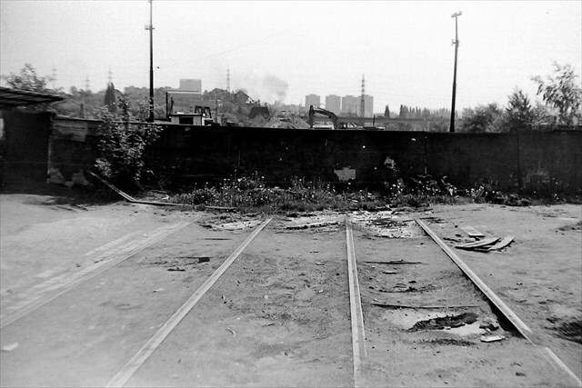 pozůstatky kolejí tramvajové smyčky v Záběhlicích, rok 1986