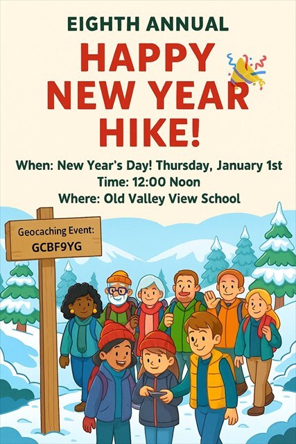 Start 2️⃣0️⃣2️⃣6️⃣ right by attending the Happy New Year Hike! By attending this event you earn a New Years day geocaching souvenir! I will be at the event coordinates for at least 1 hour for anyone who arrives late. Schedule of Events: > 12:00 NOON - Start event, sign log book > 12:15 - Raffle prizes and ammo can Additional Info: Old Valley View School is an abandoned building that is a hub for the mountain bike trails. It has been fixed up enough to be good shelter and keep us out of the elements. it is not heated and does not have a restroom. There is a porta in the parking lot. I will be at the event location for at least an hour. This is a good time to catch up with old friends, meet new contacts, tell geocaching stories, and discover / log trackables. I will bring some chairs. New geocaches will publish throughout the day.