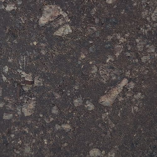 Chausey granite, more specifically granodiorite, is a plutonic rock that is bluish-grey in colour with a grainy texture and fine to medium grain size. Granite is composed of 53.5% feldspar, 31% quartz and 14.5% biotite. Dark-coloured, diffusely contoured surmicaceous enclaves can be observed. These enclaves are rich in black micas containing iron, which weather to form rust-like oxidation, creating brownish-gold spots.