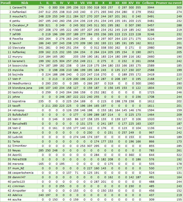 - Vitezem sezony bude hrac s nejvyssim souctem bodu za obe hry vsech eventu, kterych se ucastnil. Nezalezi jen na zrucnosti, lze vyvazit dochazkou :-).