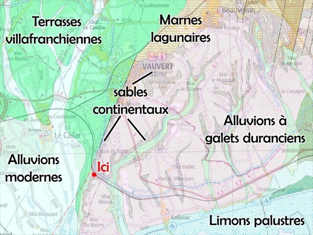 La région au sud de Vauvert présente une grande diversité de sols héritée d'une longue histoire géologique marquée par des cycles marins et continentaux successifs.