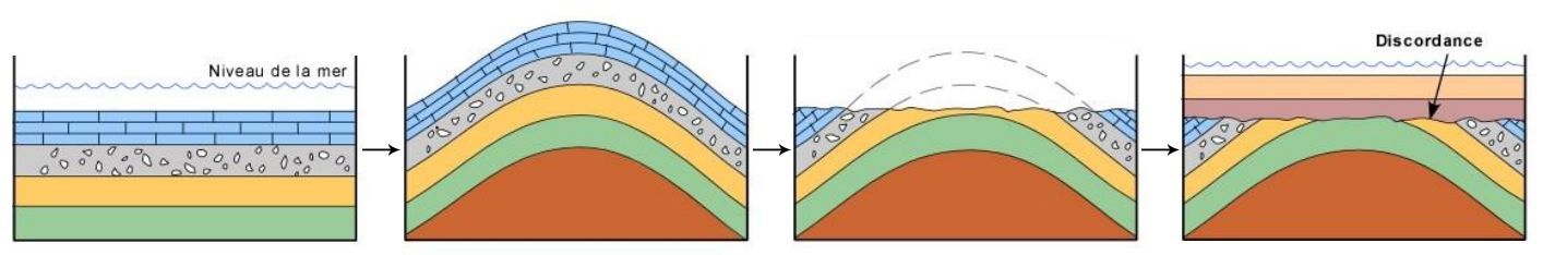 La formation d'une discordance se fait en plusieurs étapes successives. Tout d’abord, des sédiments se déposent horizontalement et forment des couches rocheuses. Ensuite, ces couches subissent des mouvements tectoniques (plissement ou basculement) qui les inclinent. Après cela, une phase d’érosion a lieu : les couches inclinées sont partiellement détruites et nivelées à leur sommet. Enfin, une nouvelle phase de sédimentation reprend, avec le dépôt de couches plus récentes au-dessus des couches anciennes érodées.