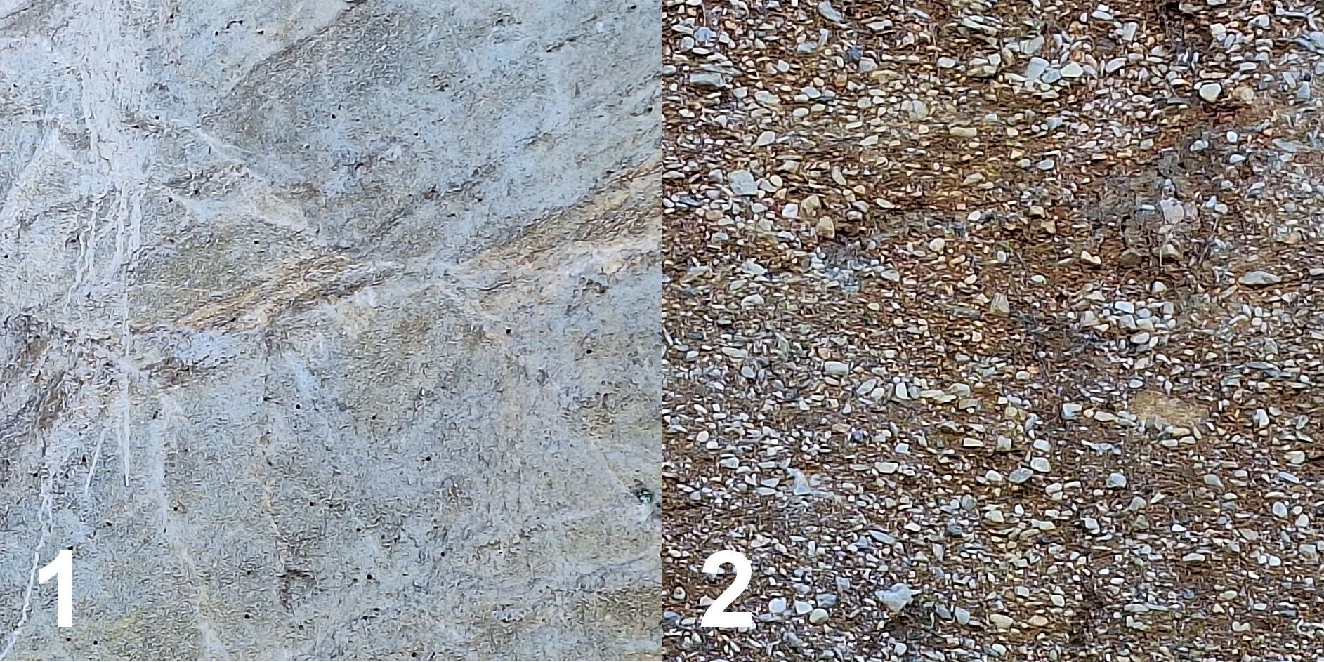 Mica schists (1) are a common metamorphic rock, generally medium-grained, with marked schistosity and foliation, rich in mica flakes visible to the naked eye, making them easy to split into shiny plates. When weathered, they become clays with low cohesion.