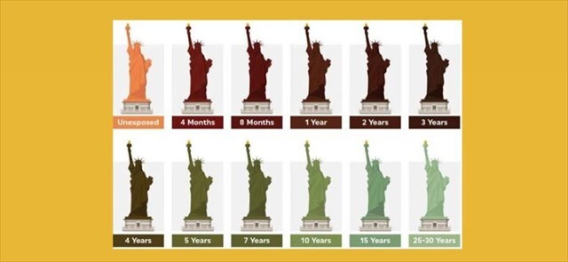 🇬🇧 Atmospheric oxidation occurs when copper is exposed to air, moisture, and carbon dioxide. This interaction forms a stable green layer called patina, composed mainly of copper carbonate. Patina acts as a protective barrier that slows further corrosion and gives copper structures and statues, such as the Statue of Liberty, their distinctive green appearance.