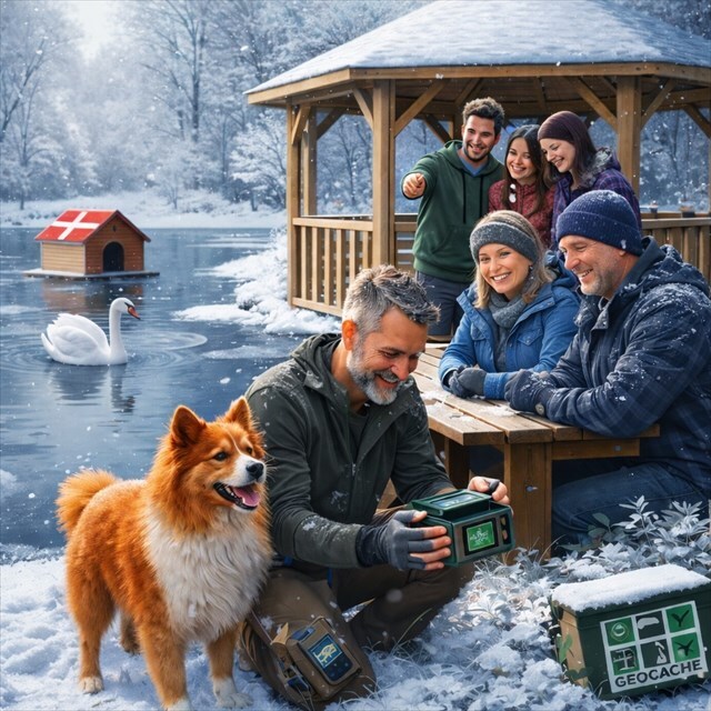 I Ullerslev har man det sidste år bygget på et nyt boligområde. Det første område hedder Højgårdsløkken og ligger når man kører mod Kerteminde. I den forbindelse er der kommet en lille sø / vandhul. Jeg husker ikke at det har været her før. Der er lavet en lille fin sti rundt om søen og der er sat bord&bænk sæt op. Perfekt til et lille geocaching event. I sommers var der svaner i søen. Hvad denne årstid bringer, kan være svær at spå om. Med en omgang hård frost, kunne det sikkert blive en fin skøjtesø. Badning vil med garanti være en kold fornøjelse og nok også ikke tilrådeligt. Så i dag bør vi nok nøjes med at nyde hinandens selskab og fortælle historier om geocaching.