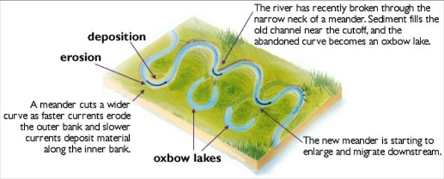 Les sĂ©diments se dĂ©posent gĂ©nĂ©ralement dans la partie convexe du mĂ©andre selon un mouvement en zigzag, puis sont transportĂ©s latĂ©ralement vers la rive. Dans les zones concaves, lâĂ©rosion domine, et lâon observe clairement le recul des berges sous lâeffet de la force centrifuge. Lorsque lâaccumulation de sĂ©diments dans la zone convexe se combine avec lâĂ©rosion de la zone concave, le lit de la riviĂšre commence Ă migrer et des mĂ©andres se dĂ©veloppent.