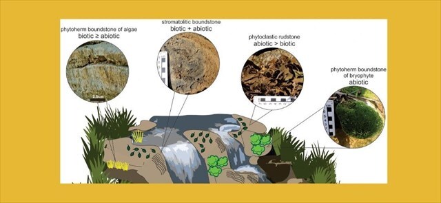 (b) Tufa in braided channels develops directly within the active riverbed. Flowing water promotes the formation of characteristic limestone bodies, especially oncoids, which are spherical structures created by the progressive coating of small grains with layers of calcium carbonate.