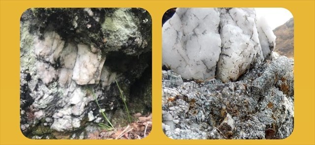 1) Comment décririez-vous les cristaux de quartz laiteux avec vos propres mots ? 2) Observez les cristaux de quartz laiteux aux coordonnées de départ. Comment décririez-vous leur dureté ou leur résistance au toucher ? 3) Voyez-vous des déformations à l’intérieur du cristal ? Expliquez pourquoi ou pourquoi pas. 4) Veuillez joindre à votre carnet une photo vous montrant ou montrant votre appareil GPS avec le quartz laiteux aux coordonnées de départ.