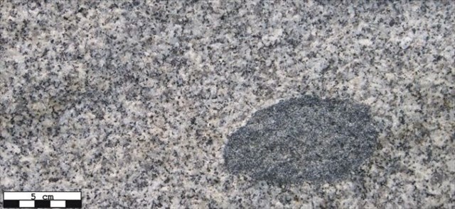 🇬🇧 These enclaves are characterized by having normally rounded or ellipsoidal shapes, having a texture between porphyritic and equigranular with a tendency to fine grain and a high content of mafic minerals. They are typical of granites, and their origin is also igneous (basic magma), which is why they can be considered proof of magma mixing (without reaching intermediate terms).