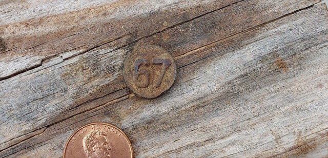 Therefore, I’m adding a new question as “proof of visit”: As you face the sign, on the right-hand side of the wooden portion of the post, about two feet above the ground, there is a “date nail” hammered into the wood. (For those who don’t know what a “date nail” is, it’s just a large nail that has a two-digit number on the head of the nail. They were once used on railroad ties to indicate what year the railroad tie was installed). Here’s an example:
