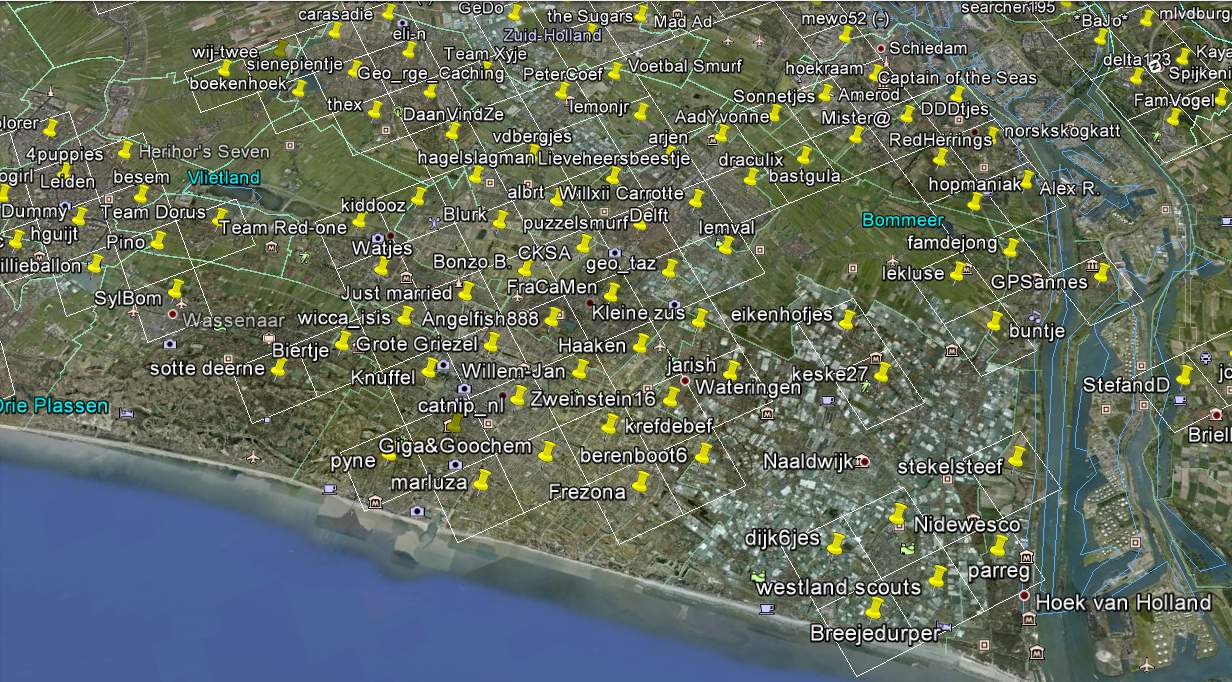 De cache-hokken zijn groter dan de hokken voor het plantenonderzoek, namelijk 2 bij 2 km, dus met een oppervlak van 4 km2. Bovendien zijn ze alleen samengesteld door ONEVEN lijnen. De hoekpunten krijgen dus altijd alleen oneven waarden. Zodoende zijn er ongeveer 10.000 cache-hokken in Nederland. Als je een hok buiten Nederland wilt dan kan dat maar wel binnen een straal van 1000 km van Amsterdam. Anders wordt de kaartproject te krom. :-) Keuze te over dus.