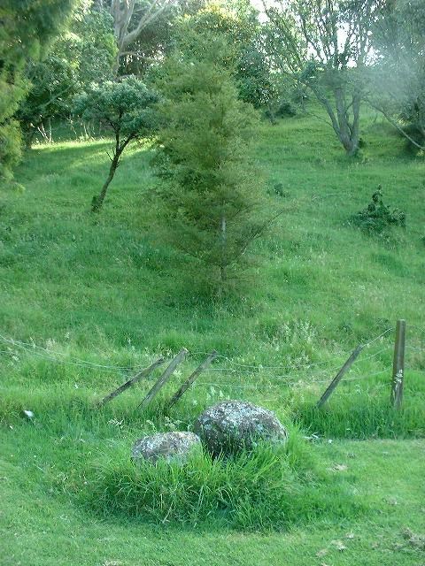 You can drive to the cache between 7am and sunset. A good place to bring your dog. First find the boulders shown above - the cache is 10 paces up the hill, and is a 2.2 litre plastic container painted green. It contains a clue for the Somewhere in Auckland cache (and also Ring Around Pupuke).