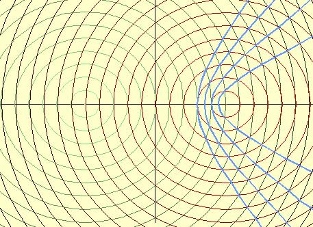 Study the diagram below to see how the blue hyperbolic LOP's are formed as constant distance differences relative to the green and red transmitting stations. I have drawn a family of 4 of these hyperbolic lines representing distance differences of 6, 7, 8, and 9 units. If there was another station we could form more families of LOP's. It is the intersection of two hyperbolic LOP's from different families that determines a position.