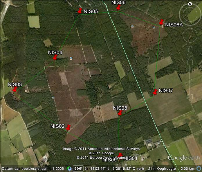 De waypoints in bovenstaand kaartje hebben een nummering met NIS01 T/M NIS09 met een extra NIS06A ertussen. Dit is gebaseerd op de nummering van de fysieke paaltjes. Aan deze nummering hoeft geen betekenis gegeven te worden.