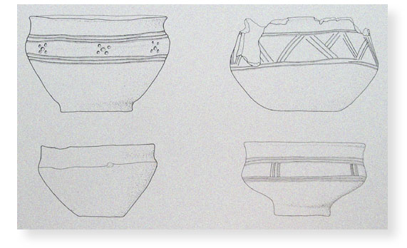 Urnen aus dem Gräberfeld mit zeittypischen Verzierungen