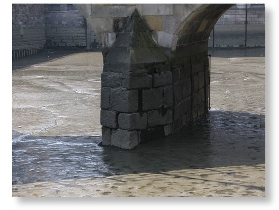 Von der zweiten Brücke dieser Serie präsentiere ich ein hoffentlich instruktives Foto. Der Ausschnitt zeigt einige Details, die für eine eindeutige Identifikation ausreichen sollten. Begib dich wieder zum blauen Schild und suche den Cache in einer Entfernung von 72 m in Richtung 250° (rwN). Das Versteck ist recht einfach, sodass du die Blicke der Passanten nicht unnötig lange ertragen musst. Angesichts der benachbarten Gebäude werden deine Koordinaten nicht unbedingt die Genauigkeit haben, die dir dein GNSS-Empfänger vorgaukelt. Sei bitte vorsichtig, damit der Cache nicht ins Wasser fällt!