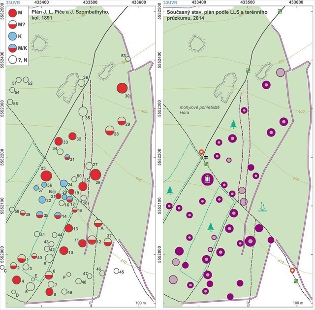 V lese zvanem Hora bylo v roce 1890 objeveno mohylove pohrebiste ze stredni doby bronzove asi ze 13. az 11. stoleti pred nasim letopoctem. Vedecky bylo prozkoumano prof. dr. Ladislavem Picem z Narodniho muzea v Praze a dr. Scombathym, archeologem z Dvorniho muzea ve Vidni. Bylo objeveno 58 mohyl, vypracovan jejich situacni planek a prokopano asi 40 z nich, nalezeno bylo mnozstvi bronzových zbrani, ozdob a predmetu denni potreby. Polovina nalezu je umistena v Narodnim muzeu v Praze a druha polovina ve Vidni. Na nejvetsi mohyle byl postaven pomnicek v upominku na pohrebiste.