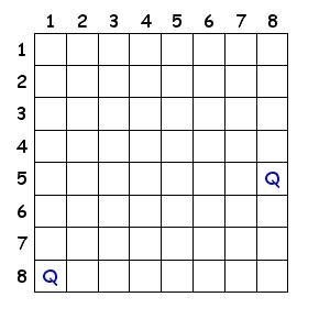 Place a total of eight Queens on the chess board below such that none can attack another. Two Queens have been placed to get you started.