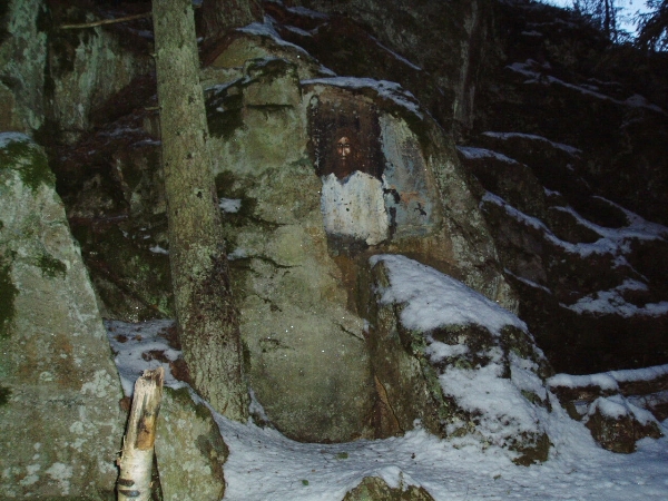 The cache is close a painting of Jesus, just north of Sandbakken. In the early sixties Helmuth Alfred Rohloff painted this and three other religious motives in the area. It's recommended to visit the cache during daylight hours so you can see this (and many the other) paintings. Cache is winter safe and close to ski tracks.