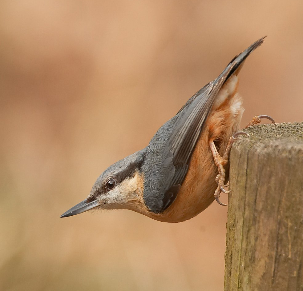 The nuthatch is a plump bird about the size of a great tit that resembles a small woodpecker. It is blue-grey above and whitish below, with chestnut on its sides and under its tail. It has a black stripe on its head, a long black pointed bill, and short legs. It breeds in central and southern England and in Wales, and is resident, with birds seldom travelling far from the woods where they hatch.