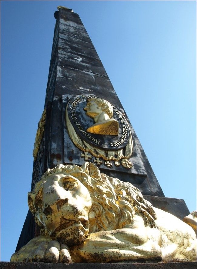 Od roku 1857 je pomník zakončen obeliskem s železným krížem na vrcholu. Ten byl totiž pruským vojenským vyznamenáním. Na přední strane obelisku mužeme číst německý nápis "Padlým hrdinum venuje vděčný král a vlast. Odpočívejte v pokoji - Chlumec 30. srpna 1813".