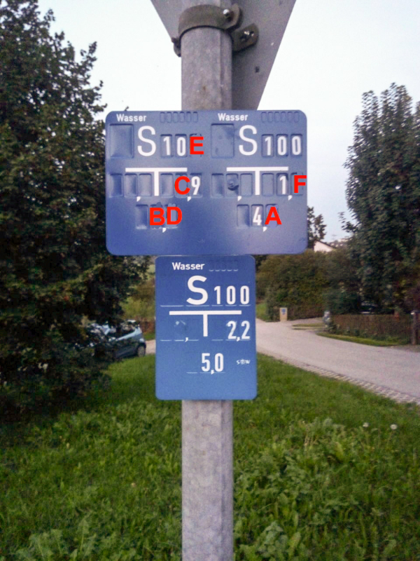 Hier hängen an Vorderseite eines Verkehrsschildes die bekannten blauen Schilder mit den Entfernungen zu den Schiebern der Wasserversorgung. Wir benötigen davon Ziffern gemäss dem Bild – vorher unbedingt ausdrucken oder anderweitig dabei haben!