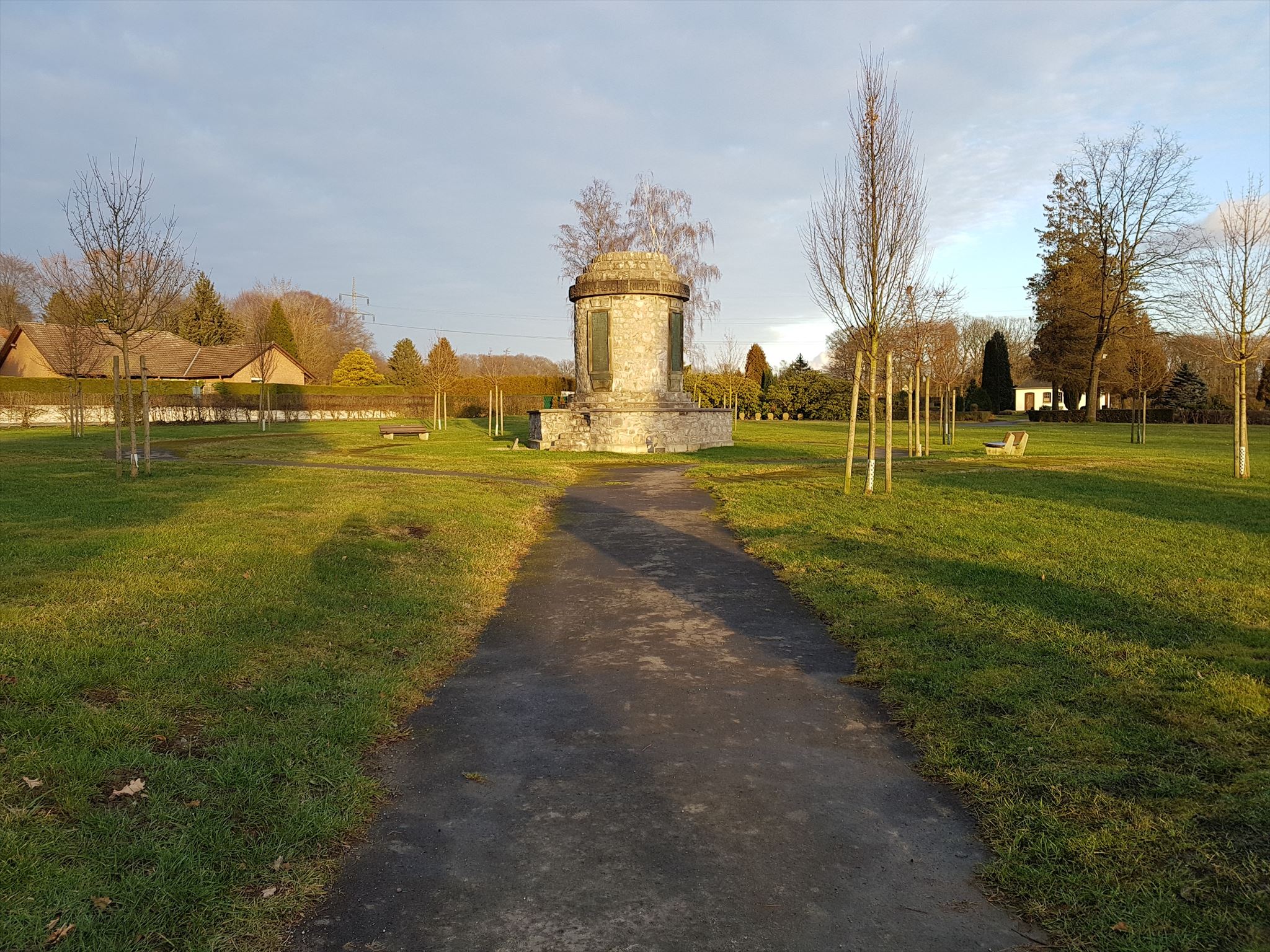 Wir entdeckten zwischen den Bäumen ein Kriegerdenkmal. Es gibt eine Tafel über Dellwig !
