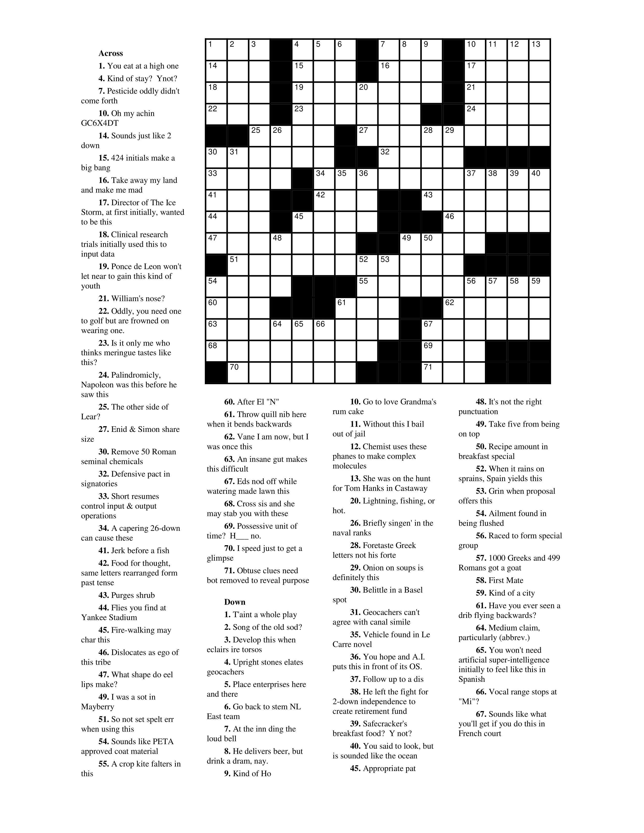 You might not need to complete the entire puzzle to find the answer, but it is my hope you will enjoy doing so. When you have completed the puzzle you will need two 'pieces' to check into Certitude. The first 'piece' is comprised of all the letters in the left hand column (ignore the black boxes). This will give you a 13 digit 'piece' as your first part of the keyword. In a similar fashion, create your second 'piece' with the 11 letters in the right hand column.
