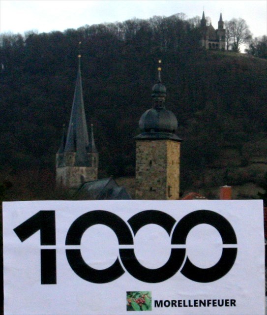 Die Silhouetten der drei Zeiler Wahrzeichen der Stadtturm, die Stadtkirche St. Michael und das Käppele auf dem Kapellenberg bilden zusammen mit dem Schriftzug "1000" das Logo des Stadtjubiläums.