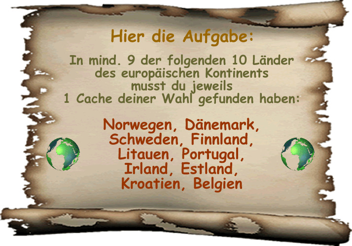 Eine Challenge für alle, die gerne in Europa unterwegs sind. Bei den Reisen kann man das Schöne mit unserem Hobby, dem Geocaching verbinden, um somit Schritt für Schritt die Anforderungen dieser Challenge meistern zu können. Also, auf gehts und in der nachfolgenden Grafik gibt es die Vorgaben und Anforderungen für dieses Abenteuer, wobei ihr sicherlich viele sehenswerte Caches meistern werdet: