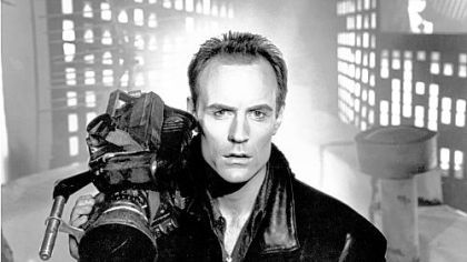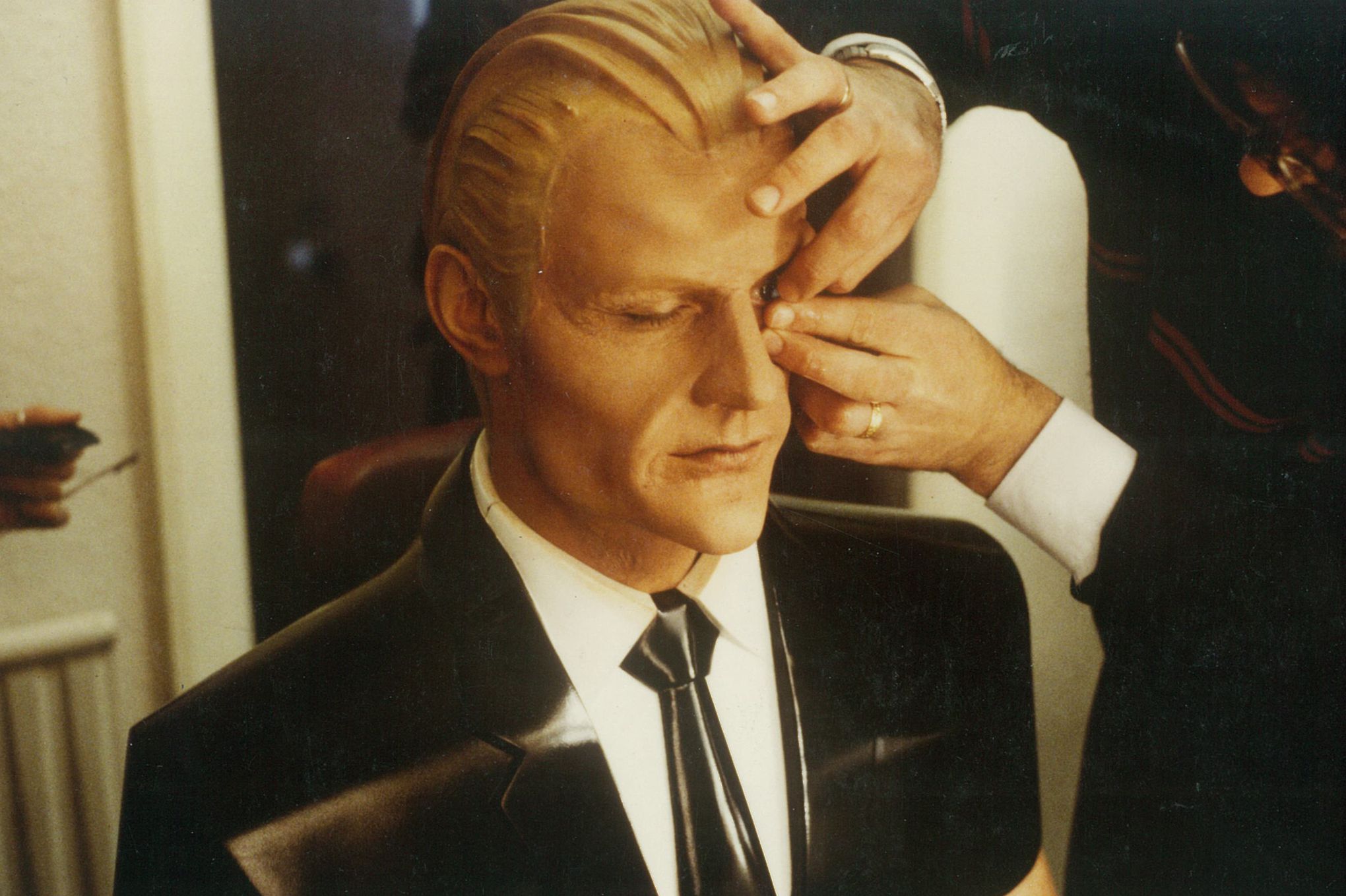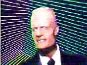 The classic look for the character was a shiny dark suit—which was actually a fibreglass mould—often paired with Ray-Ban Wayfarer sunglasses. Only his head and shoulders were depicted, usually against a "computer-generated" backdrop of a slowly rotating wire-frame cube interior, which was also initially generated by analogue means—in this case traditional cel animation, though later actual computer graphics were employed for the backdrop. Another distinguishing trademark of Max was his chaotic speech patterns—his voice would pitch up or down seemingly at random, or occasionally get stuck in a loop. These modulations, achieved with a harmonizer, also appeared when the character was performed live.