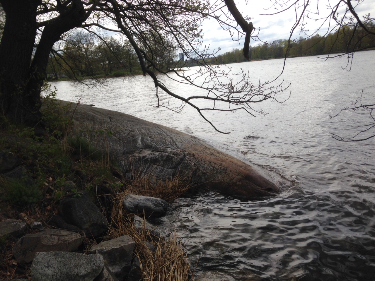 Here you find yourself near present-day sea level (do not slip in!) while on a 1.9 billion years old seabed. The rocks in the appliance has made a long journey, from the seabed to deep down in the earth's crust and then up to the surface again. The veined gneiss on the site was formed by alternately muddy (dark) and sandy (light) sediments from an ancient seabed. During the subsequent orogeny the sediments were pressured deep in the earth's crust, which was folded and then deformed. Some batches melted up so bright veins of quartz and feldspar formed. The appliance on one end broke the newly formed gneiss by penetrating Stockholm Granite. Finally, the rocks were laid bare again at the Earth's surface by bedrock raised up and the overlying rock eroded away.