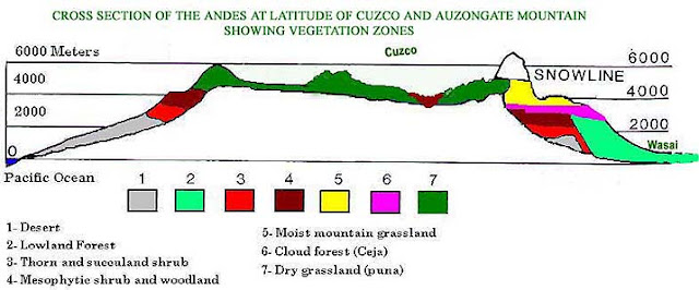A capital Lima esta bem próxima do mar e a menos de 130km da costa já existem picos de 6.000m, depois disso, há inúmeros altos e baixo em uma região bastante acidentada sobre a cordilheira oriental (ou leste) onde está localizada a cidade de Cusco (3.400m) e a famosa Machu Pichu. Então, sair de Lima e viajar em direção a Cusco é um desnível de mais de 3mil metros de altitude. Em meio a esses altos e baixos da Cordilheira Oriental, alguns picos ultrapassam os 6.000m que é o limite denominado snowline, ou seja, acima dele os picos começam a se manter nevados devido a elevada altitude.