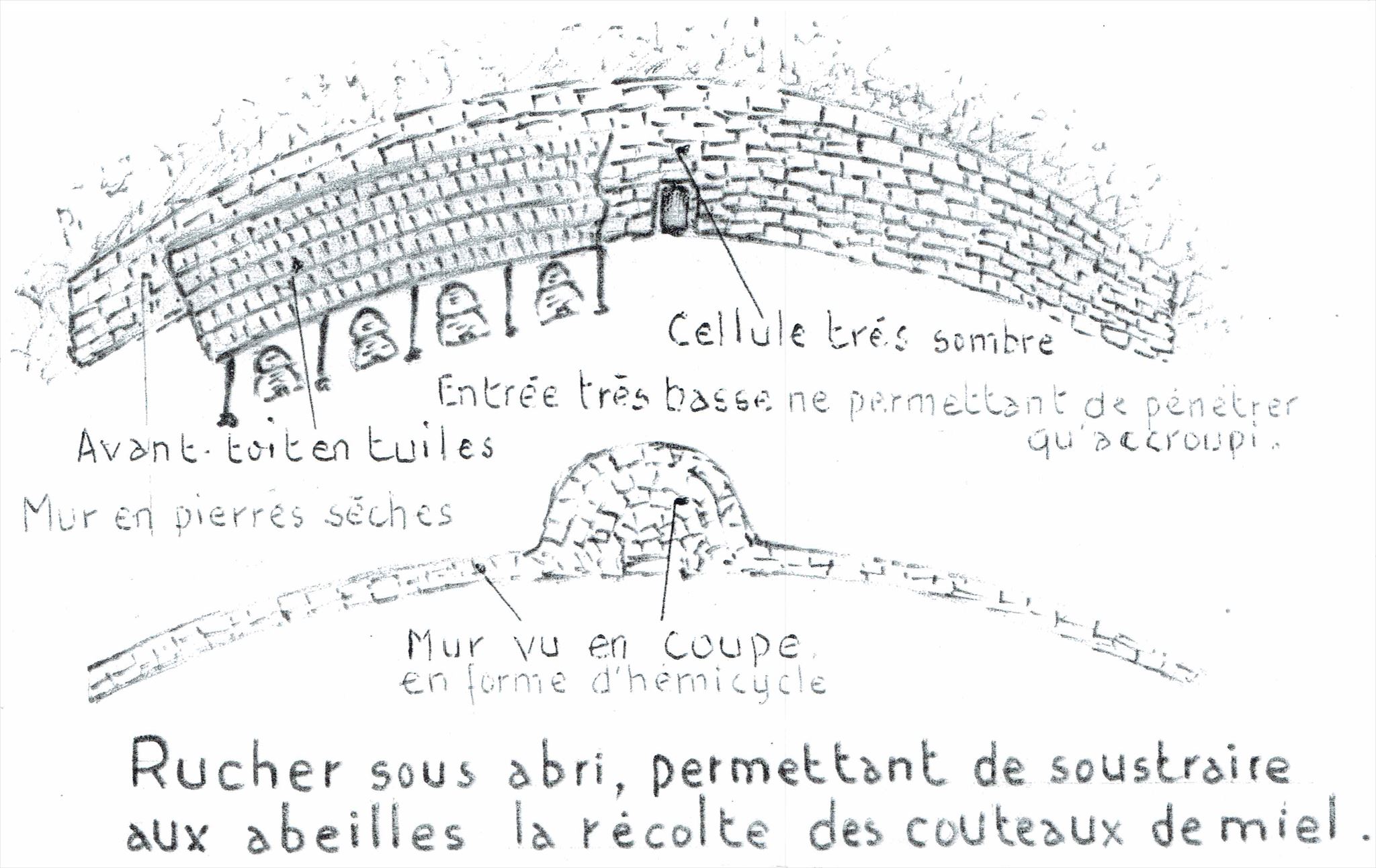 L'abri construit en plein coteau en forme d'hémicycle pour résister à la poussé du terrain, comporte en son centre une cellule montée en encorbellement et accessible seulement par une entrée étroite et basse rendant le local sombre et frais, prévu essentiellement pour la récolte des couteux de miel.