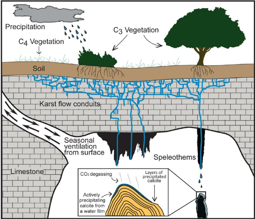 Cita veida kalcīti var veidoties arī alās kā stalaktīti un stalagmīti. Šīs veidošanās metodes rezultātā veidojas kriptokristāliskais sastāvs, kas raksturīgs šim minerālam.