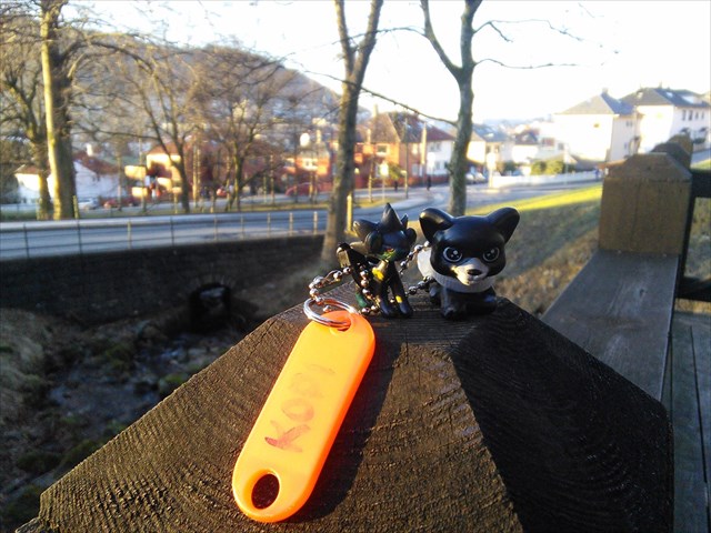 This travelbug was made by 'Seacat & Norri' (Austria). I chatted with them about some caches we had visited in Barcelona, and then they said they would give me a travelbug - my first! They attached a "Norris Wooden Geocoin" as security guide to the journey. The cat started its journey in Vienna in May 2014, and seemed lost in Germany in 2015. Now in 2016 l have marked it as missing, and released a copy with two black cats on, in Bergen.