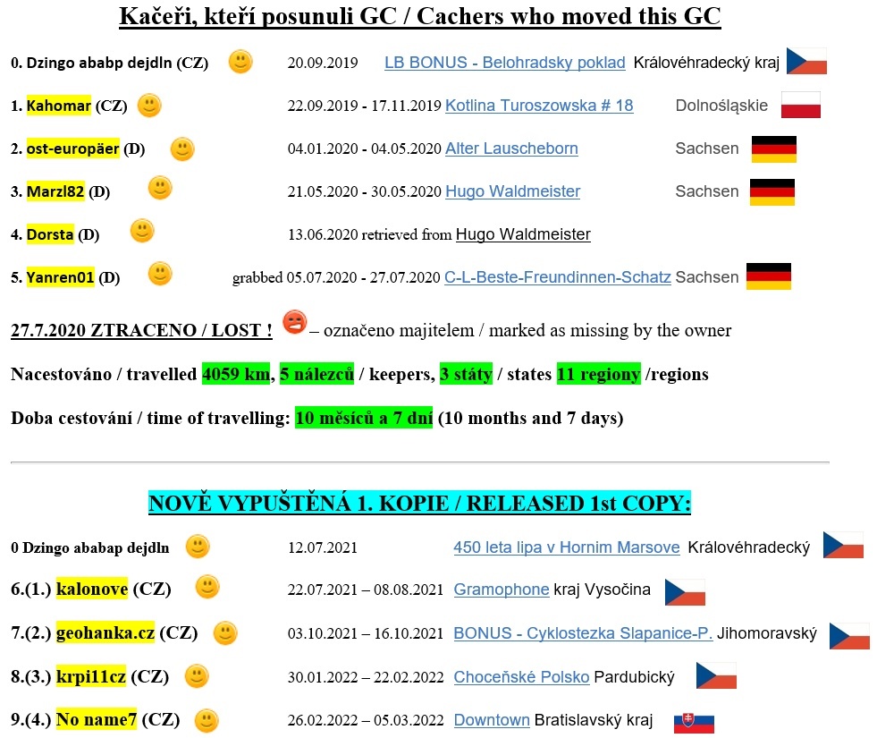 This trackable traveller is in honour of my first Linden tree, which I sowed in a pot 8.3.1998 and which I replanted to the newly formed, but damaged, linden alley to Mohejlíku – memorable place in Hořice v Podkrkonoší. It is Large-leaved Lime (Tilia Platyphyllos), it is doing very well and always when I'm going around, looking forward from each other presence. It's beautiful to see how it grows and is full of life.