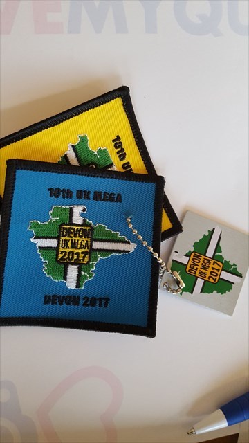This is a Devon Mega square tag with the two different sew on patches attached. The Yellow one was available for general sale whilst the blue one was specifically designed for the Suporters Packs. The idea of this trackable is to travel from cache to cache visiting all the sites of the Annual UK Mega before hopefully being reunited with me at a future Annual UK Mega that I attend.